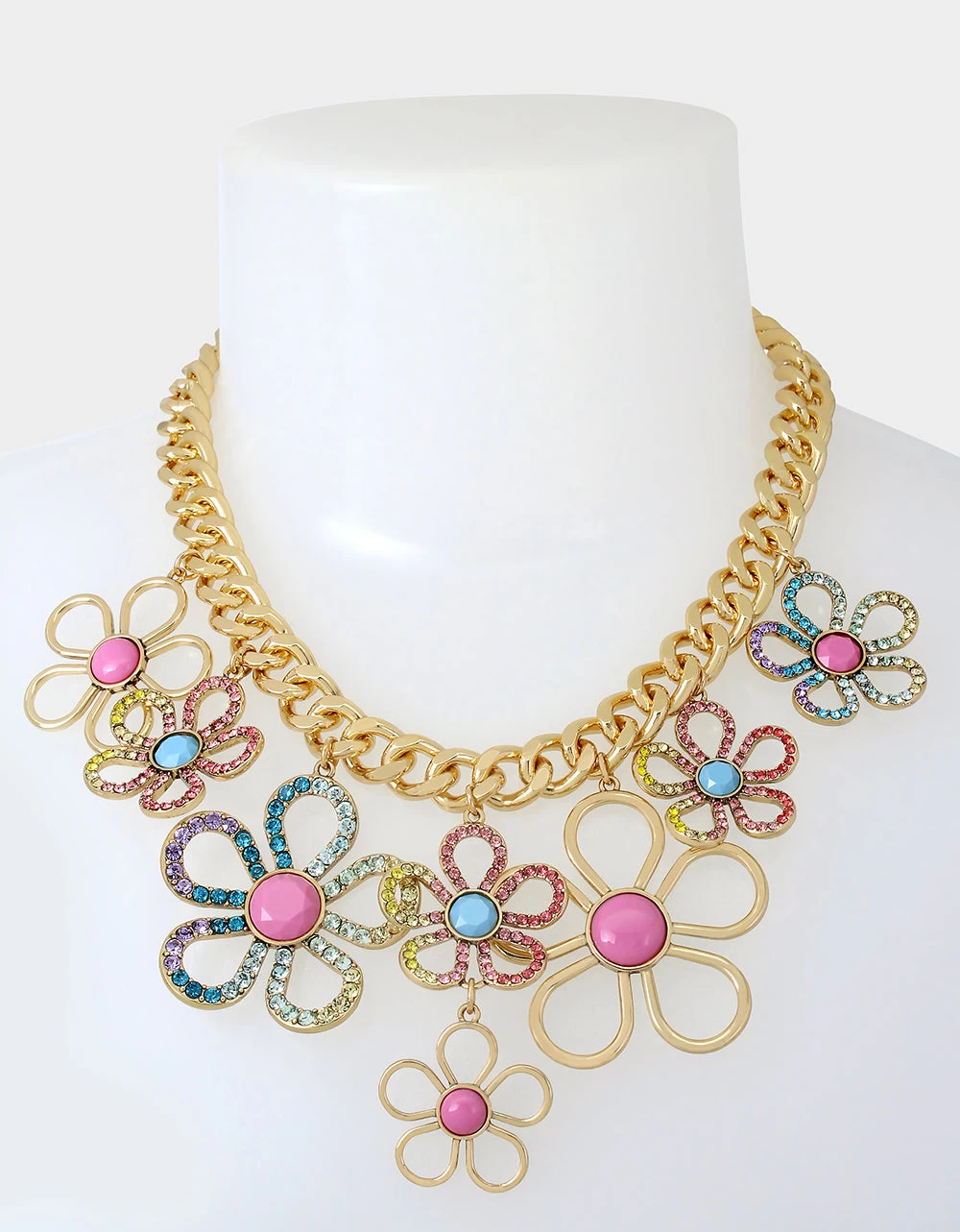 Striking curb chain necklace featuring playful flowers at front adorned with vibrant pink and blue center stones and delicate multi-colored stone accents. Necklace has an adjustable lobster clasp closure. Made from polished metal, glass and resin.