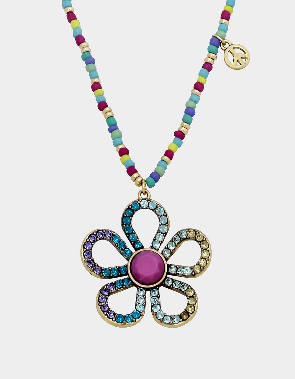 Refined chain slider necklace featuring colorful seed beads, and groovy flower pendant adorned with multi-colored stones. Necklace has an adjustable slider closure. Made from polished metal, glass and resin.