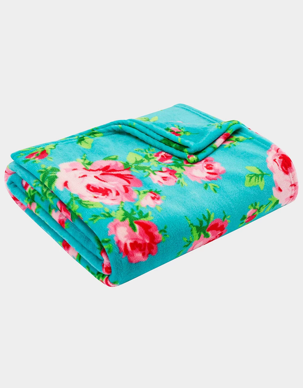 Add a pop of color to your home décor with the Betsey Johnson bouquet day ultra-soft plush throw. Featuring pink blossoming flowers on a vibrant aqua ground, this super soft throw is sure to make a statement wherever it lays. Pair this throw with Betsey Johnson bedding or with your current bedding ensemble