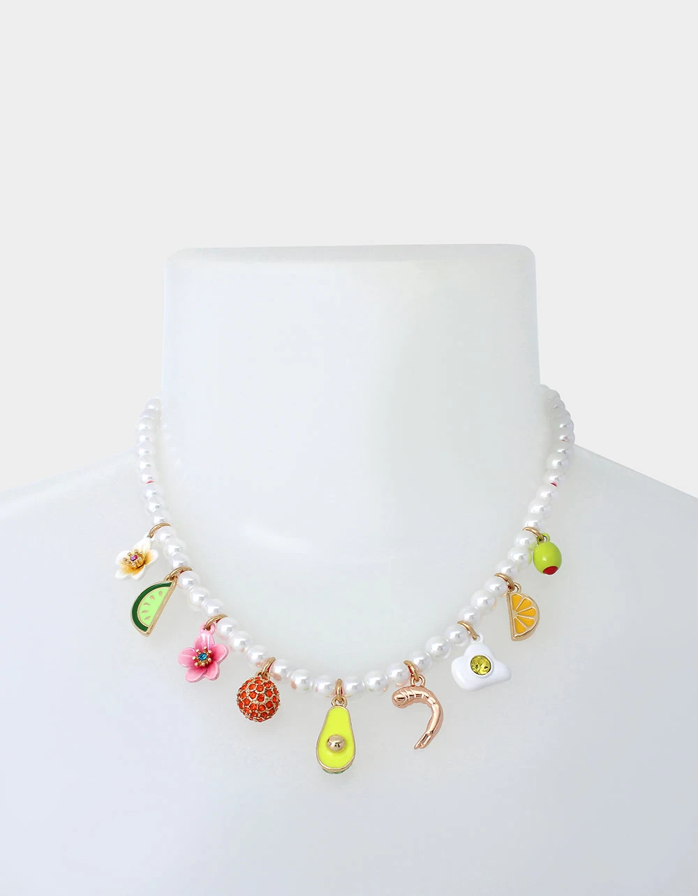 Delicate pearl strand necklace featuring playful brunch inspired charms at front adorned with minimal stone accents and colorful details. Necklace has an adjustable lobster clasp closure. Made from polished metal, imitation pearls, glass and enamel.