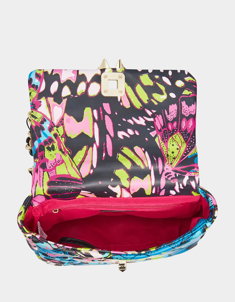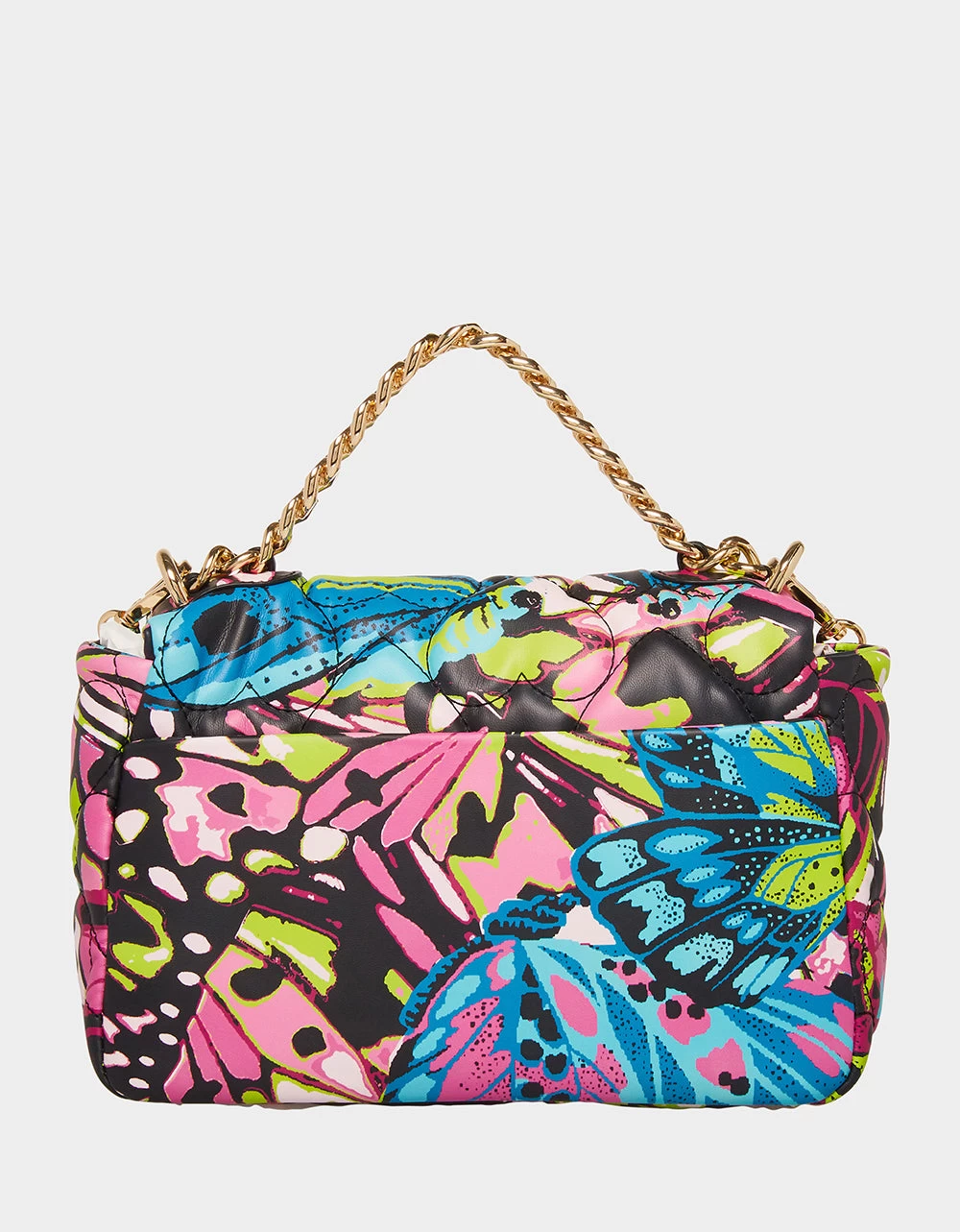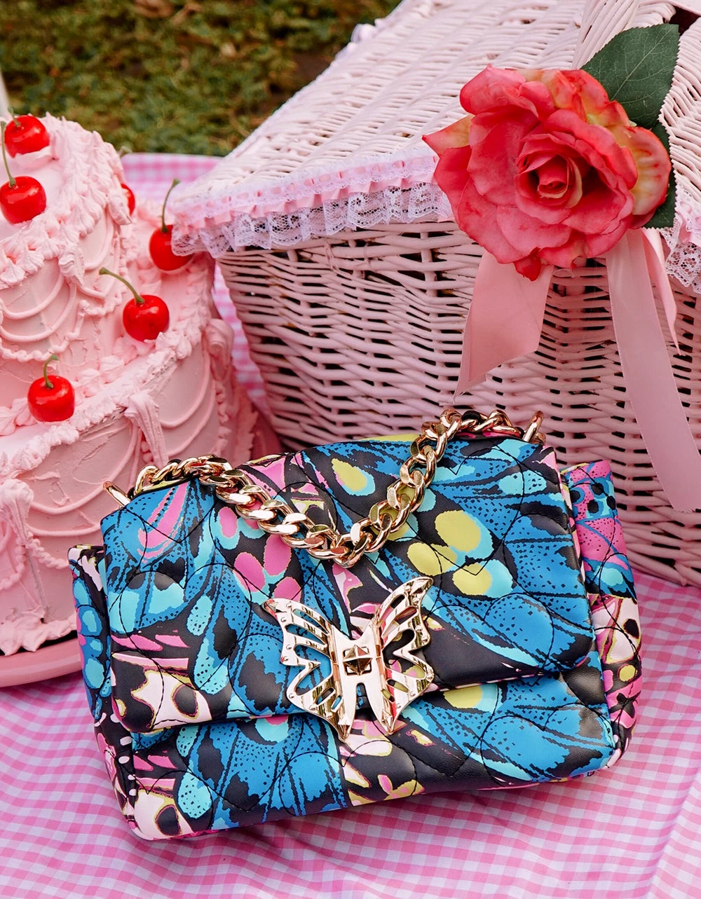 Elevate your style with the colorful BUTTERFLY LOCK crossbody bag. Decorated in gold-tone butterfly with quilted hearts.
