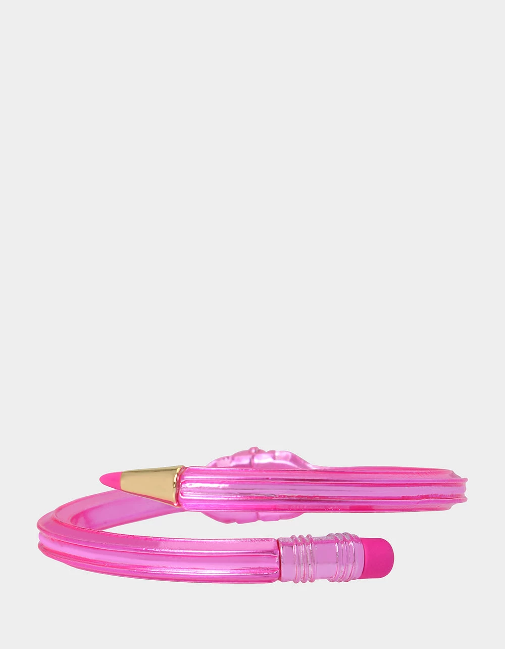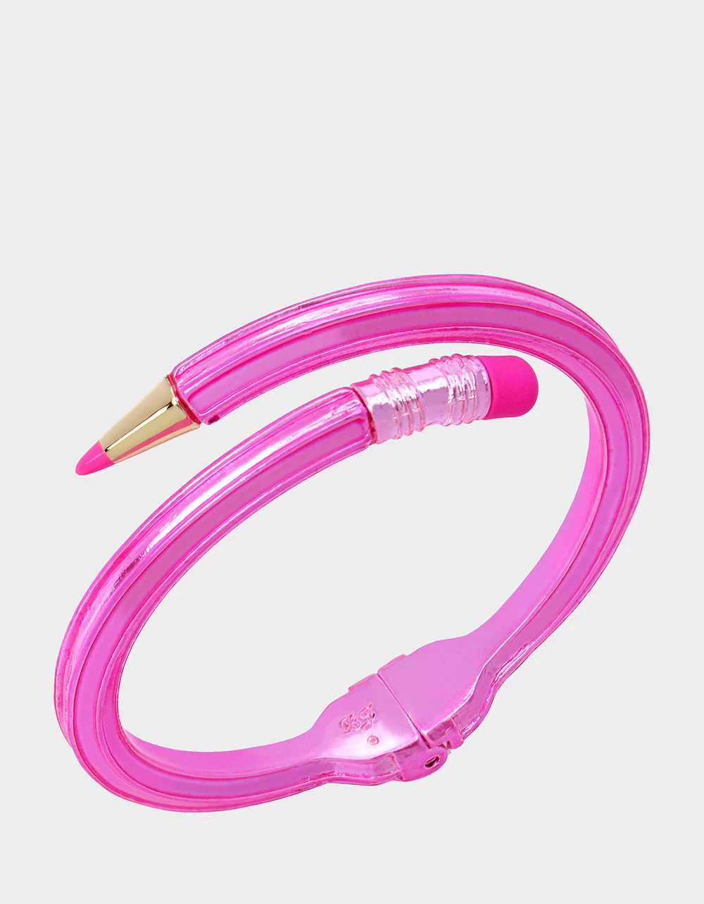 Playful pink pencil motif hinged bangle bracelet perfect for back to school. The bracelet has an easy hinge closure. Made from metal and enamel.Â