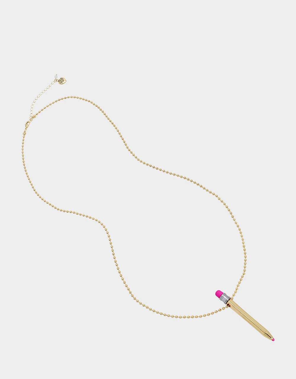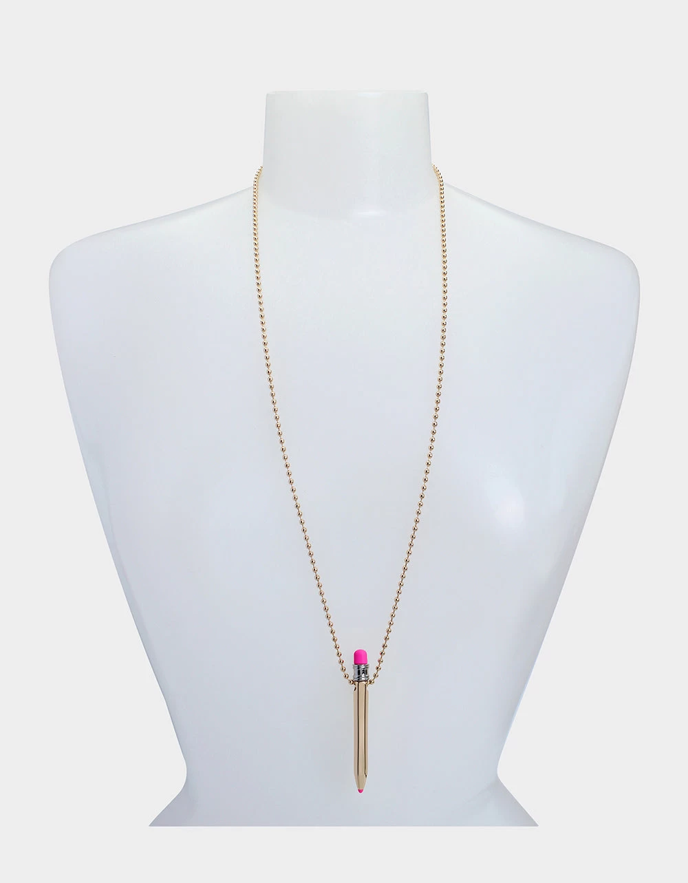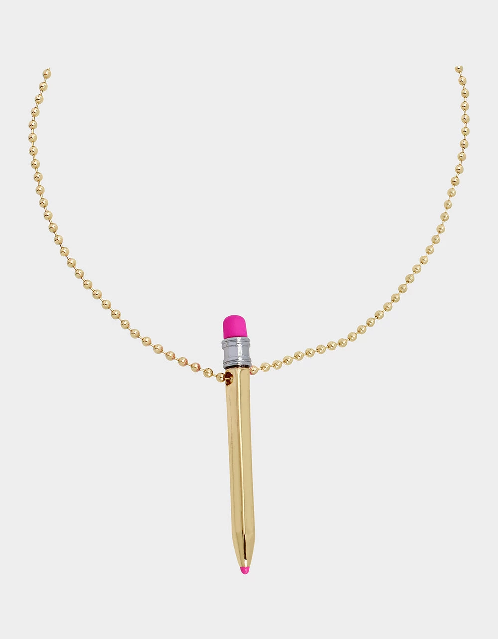 Long ball chain necklace featuring playful gold pencil pendant. The necklace has an adjustable lobster clasp closure. Made from metal and enamel.