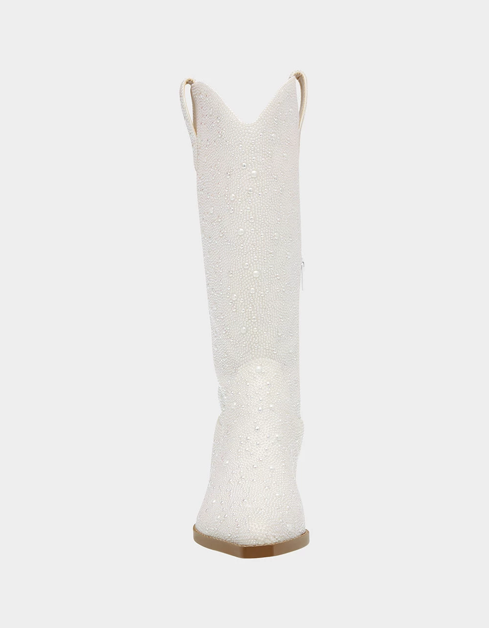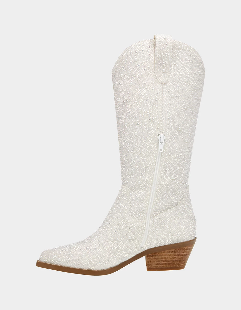 Add some bling to the classic cowboy boot style with the DALAS pearl boot. Whether you’re heading to a country concert, a festival, or just looking to make a statement, these white boots are a perfect choice.