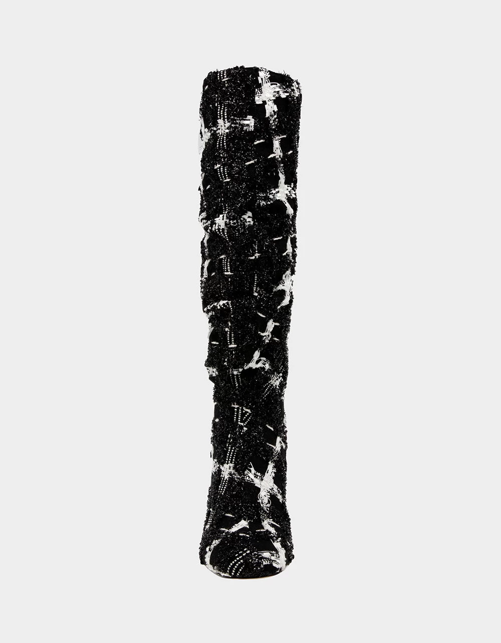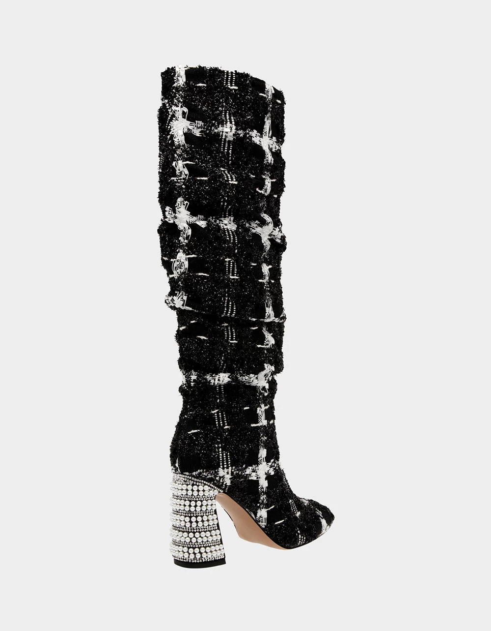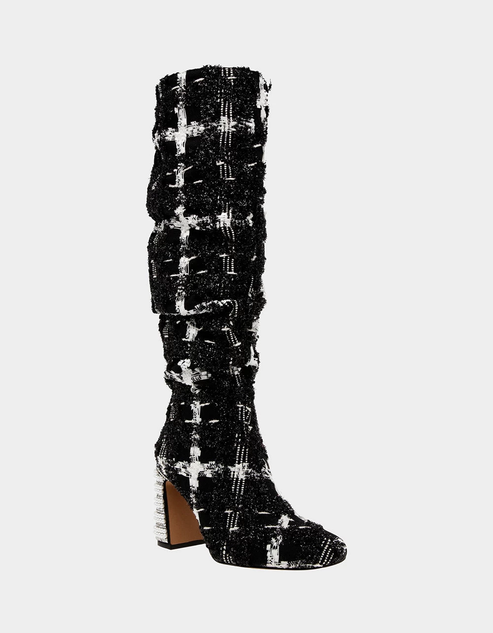 Be bold and stylish in the DECLAAN plaid boot. This boot is a timeless style paired with a sparkling pearl heels to add pizzazz to your ensemble.