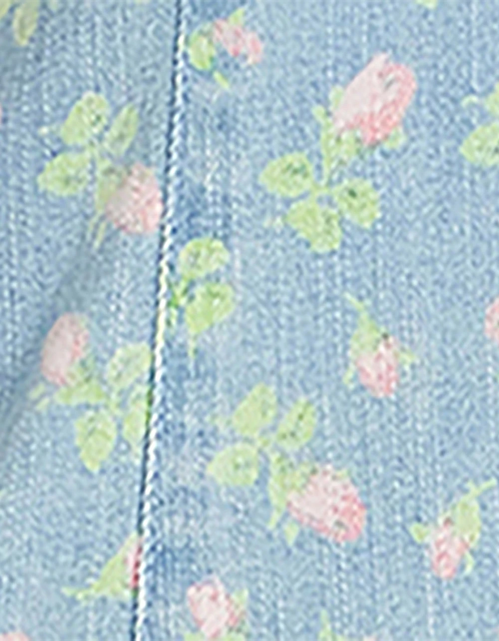 Turn up the heat in this denim mini dress that has a corset-style bodice with zipper front closure. This chic mini dress also features adjustable spaghetti straps and a pink floral print.