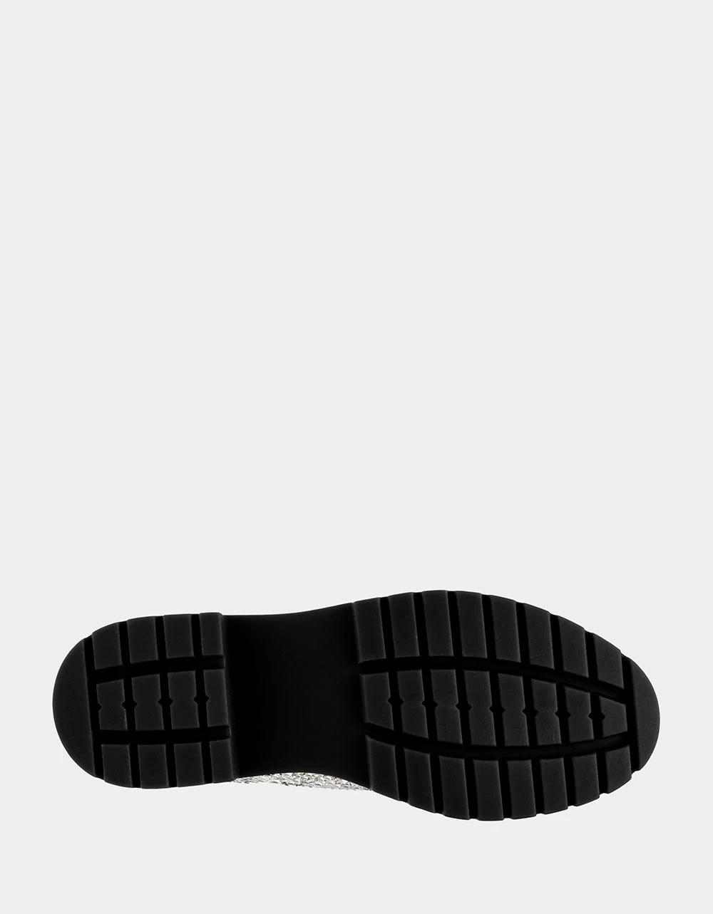 Add some sparkle to your look with a classic combat boot in all-over embellished rhinestones and pearls. Style these boots with your favorite party dress or casual jean.