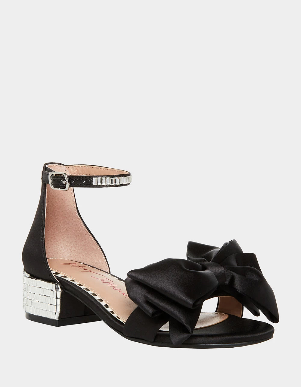 Bring dazzle and drama to any ensemble with the KIDS’ MADDY heel! These bold and beautiful block-heeled shoes feature an oversized satin bow and sparkle details.Â