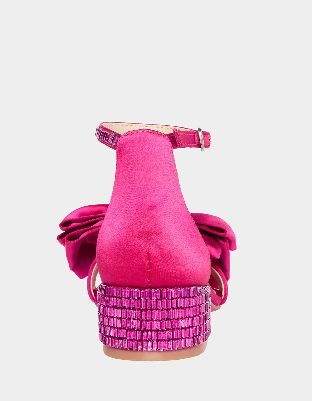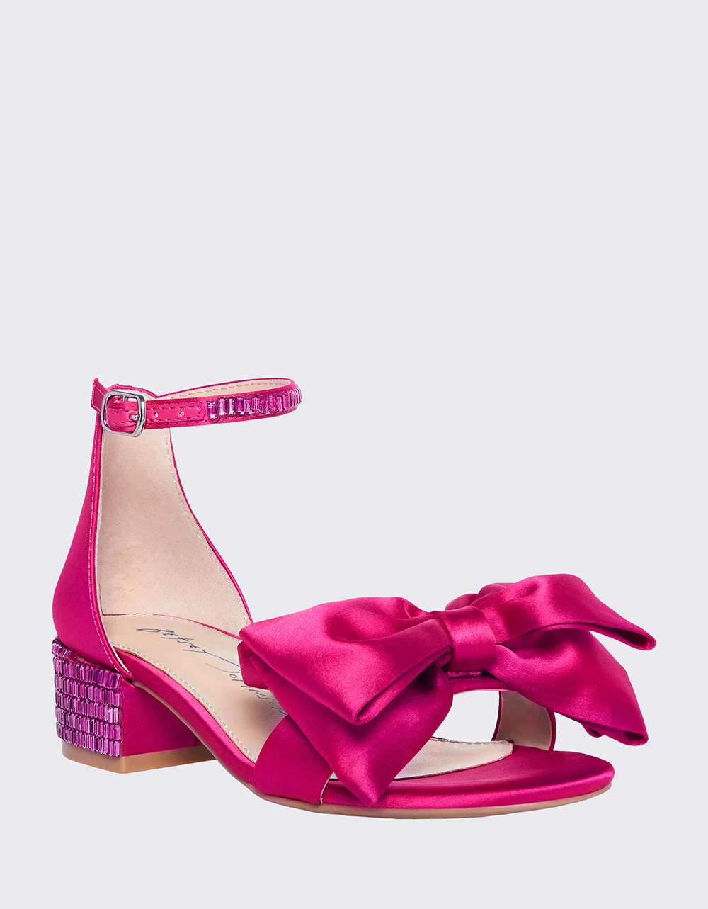 Bring dazzle and drama to any ensemble with the KIDS’ MADDY heel! These bold and beautiful block-heeled shoes feature an oversized satin bow and sparkle details.Â