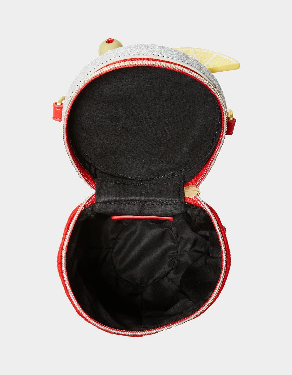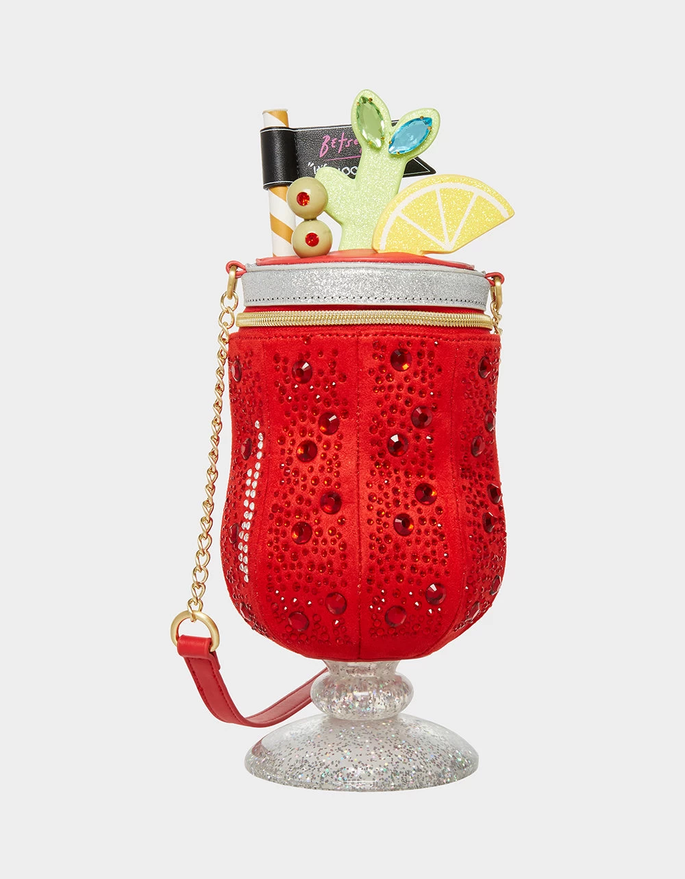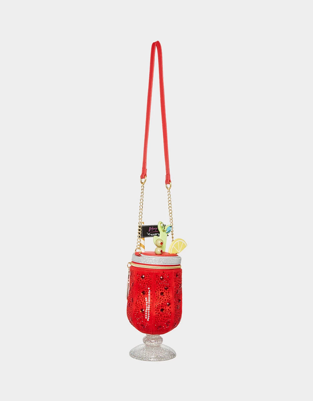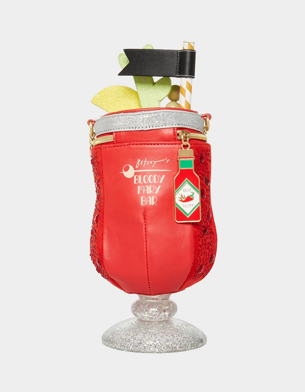 It’s Brunch O’Clock somewhere!! Be the talk at the table with this bloody mary cocktail-inspired crossbody bag. It features a glitzy rhinestone exterior, a metal hot sauce zipper pull, toppers for garnish, and a molded glitter bottom to stand up tall at the table. Cheers!!