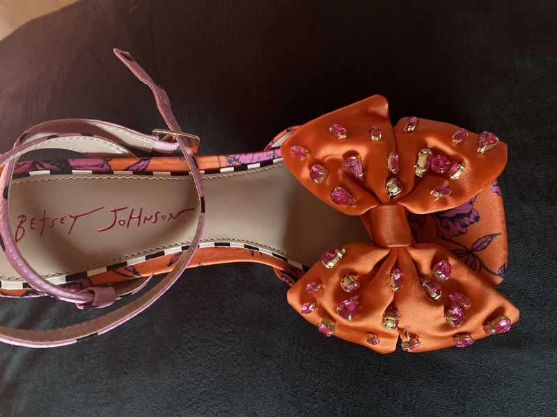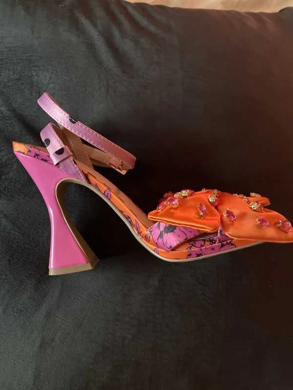 - Orange satin upper with pearl embellished bow