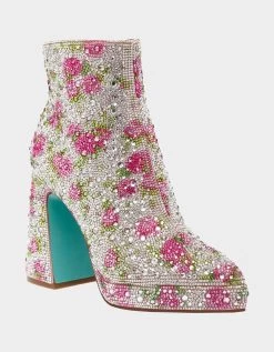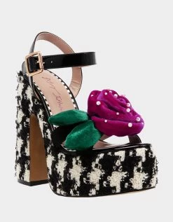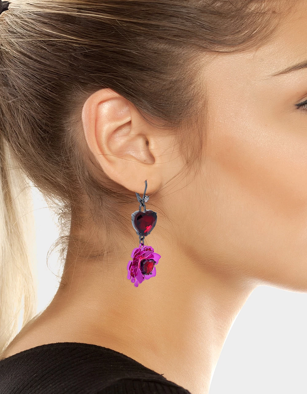 Vibrant mismatched drop earrings featuring fuchsia flowers paired with red stone hearts. Earrings have a lever back closure. Made from metal, enamel and glass.Â