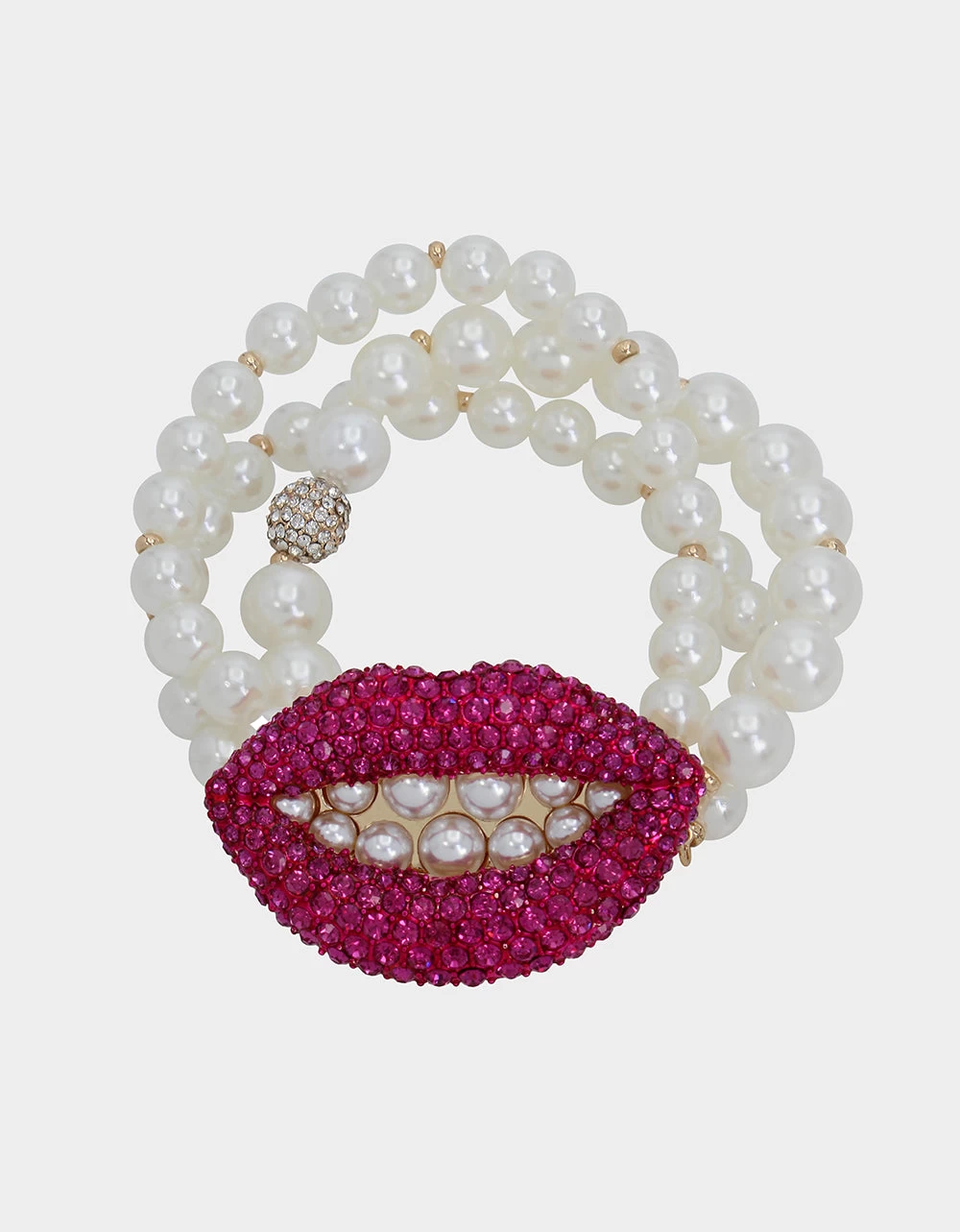 Charming multi-row pearl bracelet featuring vibrant pink pave lips adorned with playful pearl grill. The bracelet has a box tongue closure. Made from metal, glass, and acrylic pearl.Â
