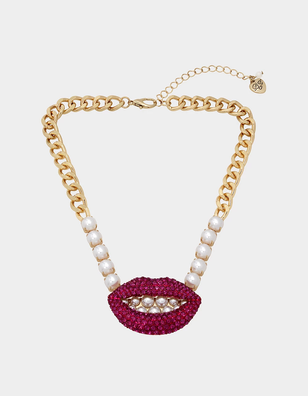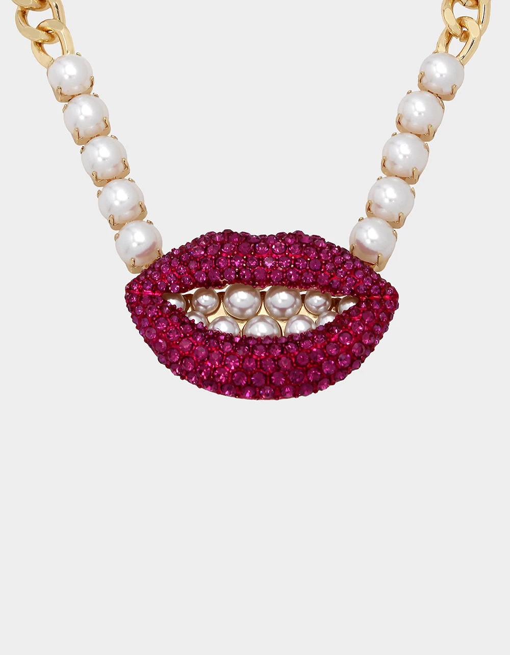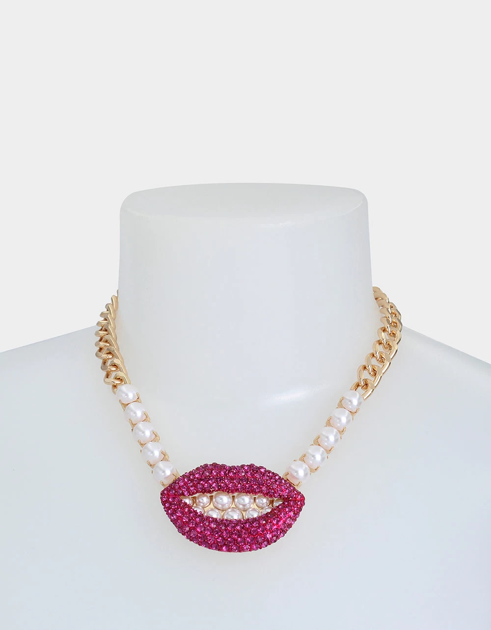 Striking chain necklace featuring pearls and glistening pink pave lips adorned with playful pearl grill. Necklace has an adjustable lobster clasp closure. Made from metal, glass and acrylic pearl. Lobster clasp GOLD Metal/Glass/Acrylic pearl