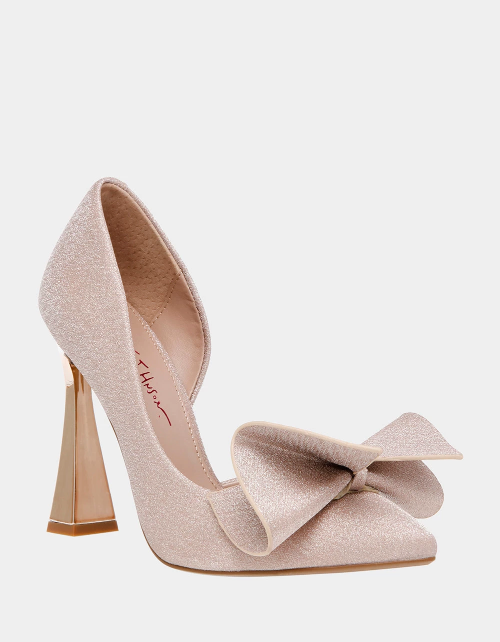 Step into style with these sparkling glittery metallic pumps with a charming bow detail. Perfect for adding a touch of glamour to any outfit, these pumps feature a sleek and glossy metallic heel with a touch of glittery fabric for a truly eye-catching look.