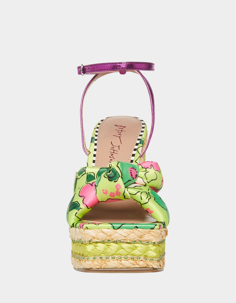 Featuring a colorful wedge heel perfect for summertime, this design offers a raffia braided back and a printed toe strap for a stylish look.