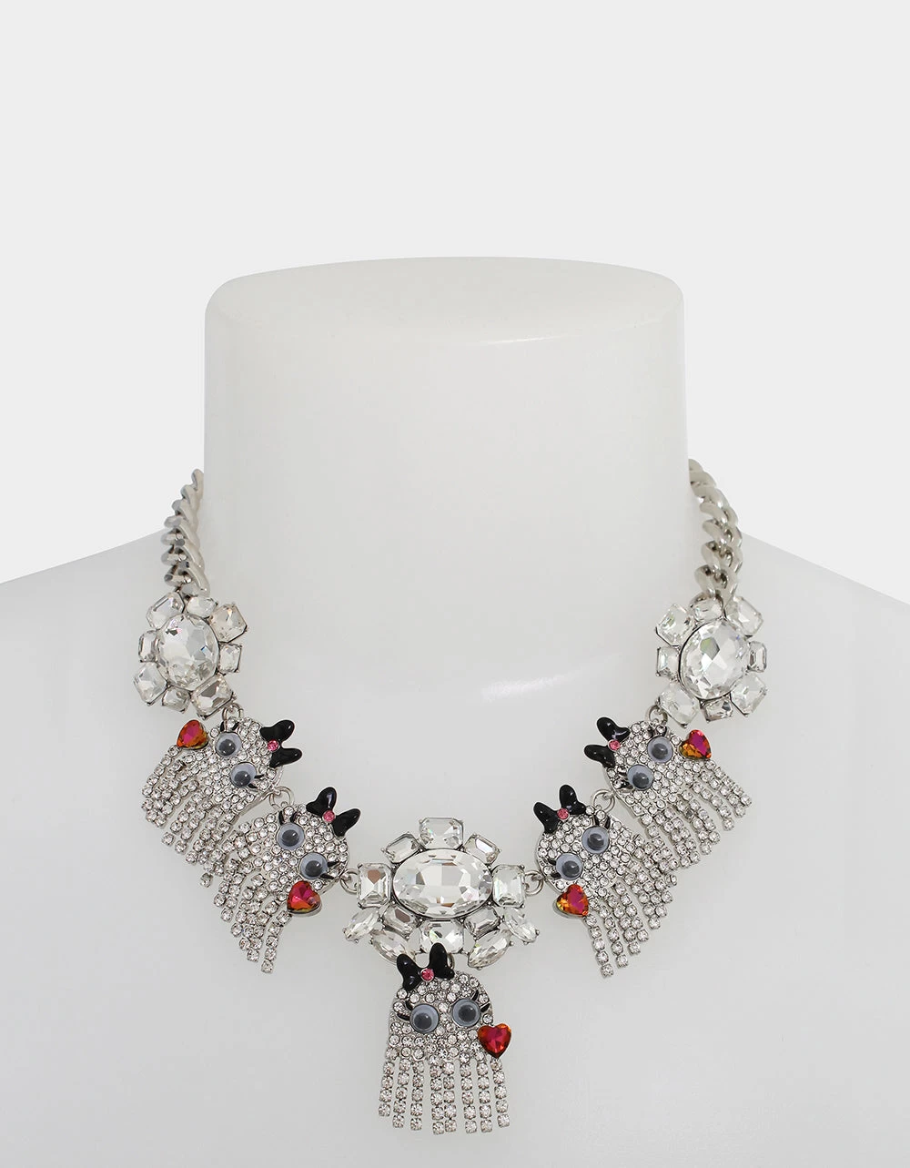 Sturdy chain necklace featuring glistening vintage-inspired stone gems and friendly ghosts adorned with playful googly eyes and sparkly rhinestone fringe. The necklace has an adjustable lobster clasp closure. Made from metal and glass.