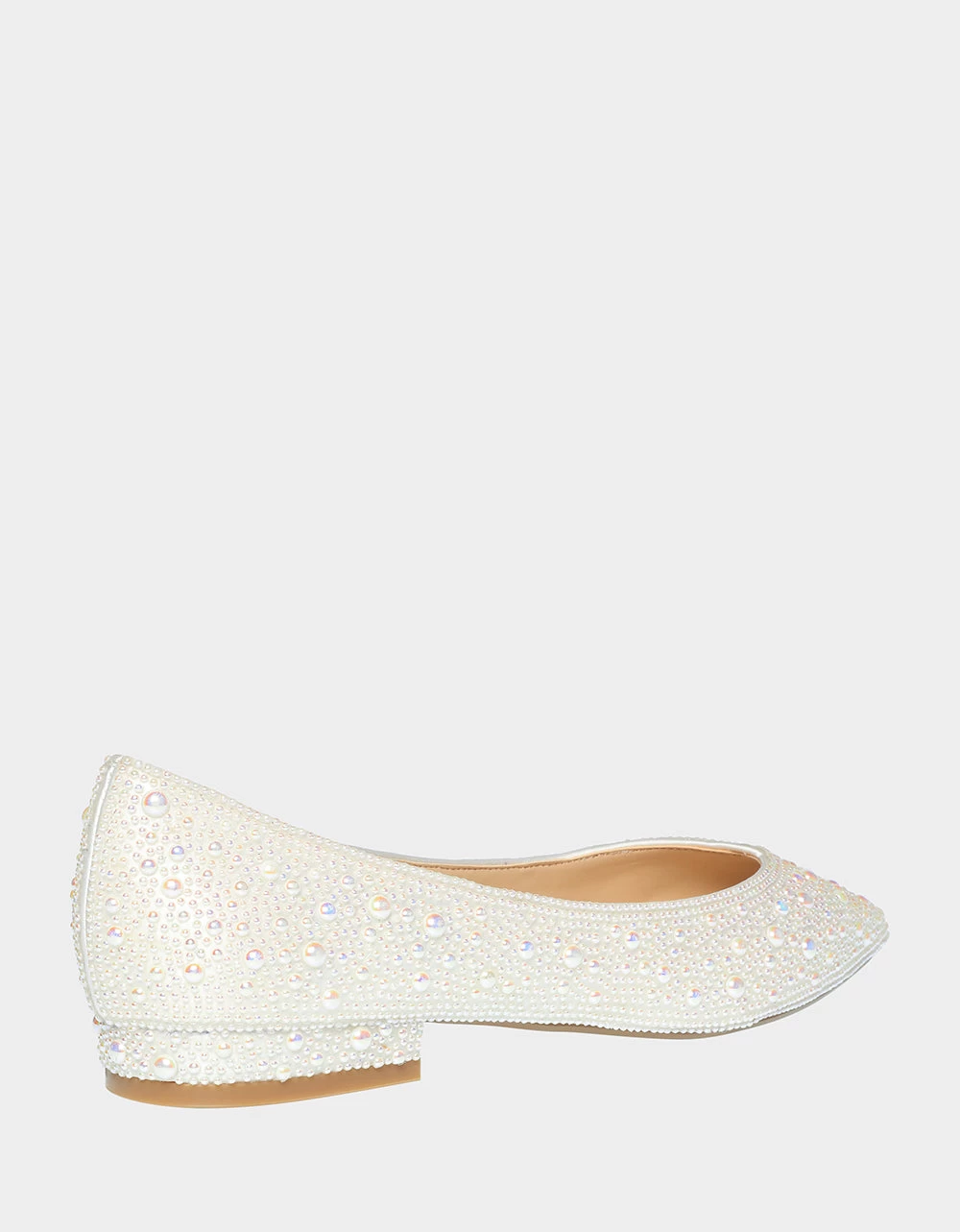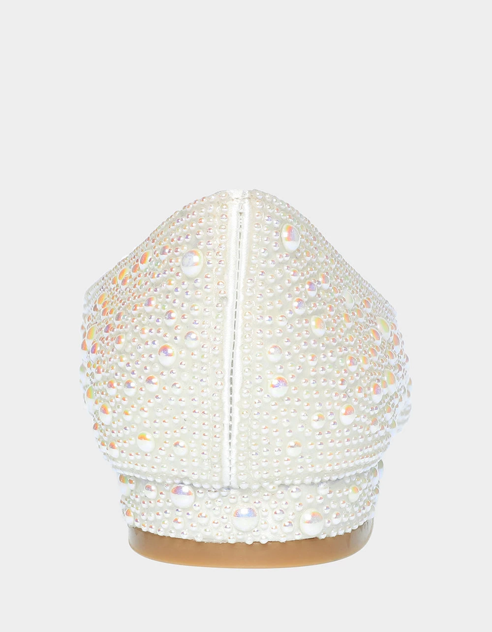 This classic Ivory pearl ballet flat silhouette features a pointed toe and is decked out in pearls for embellishment.