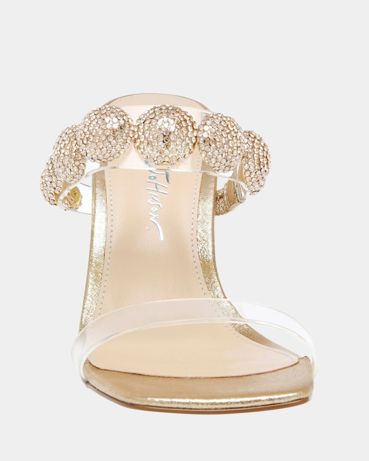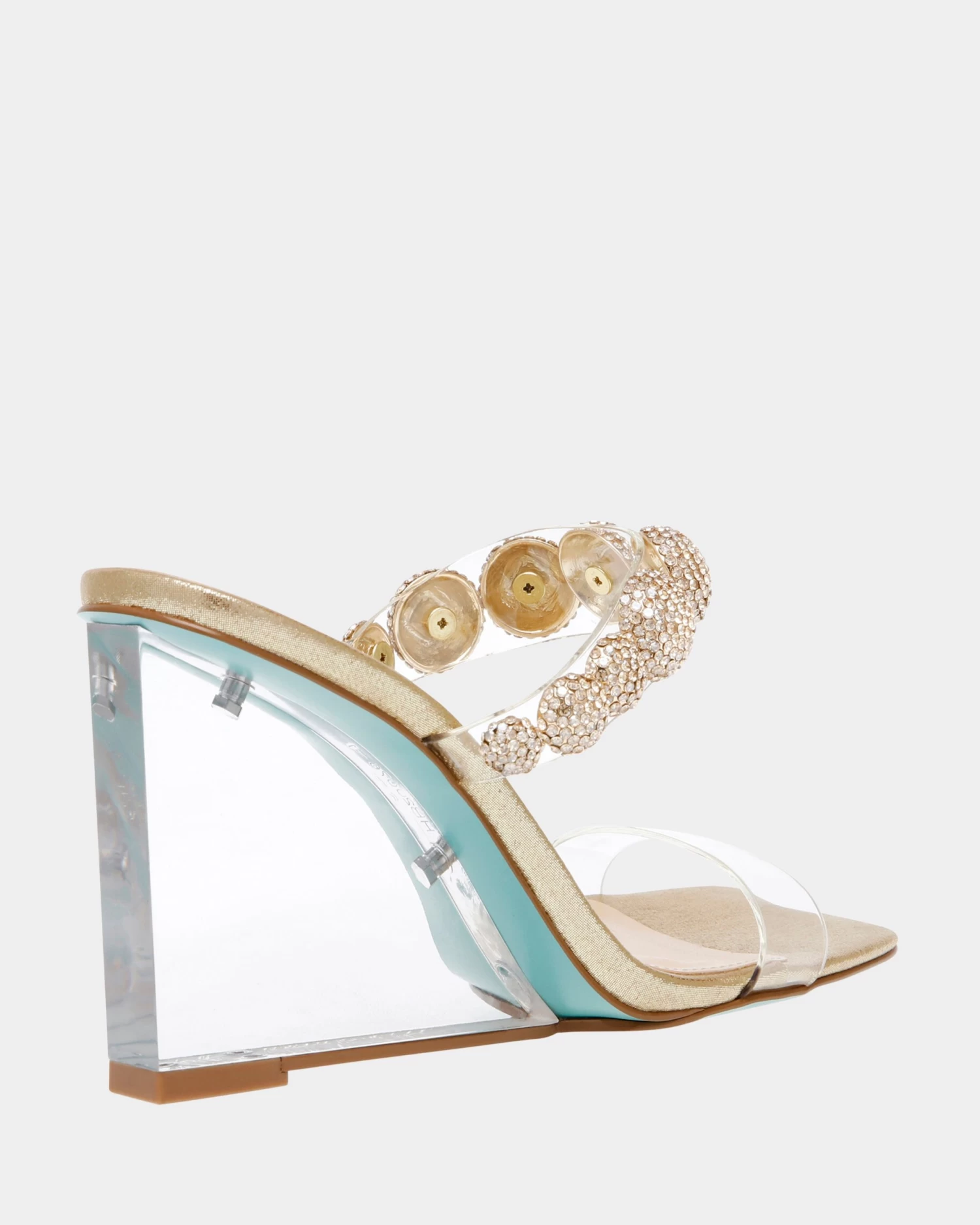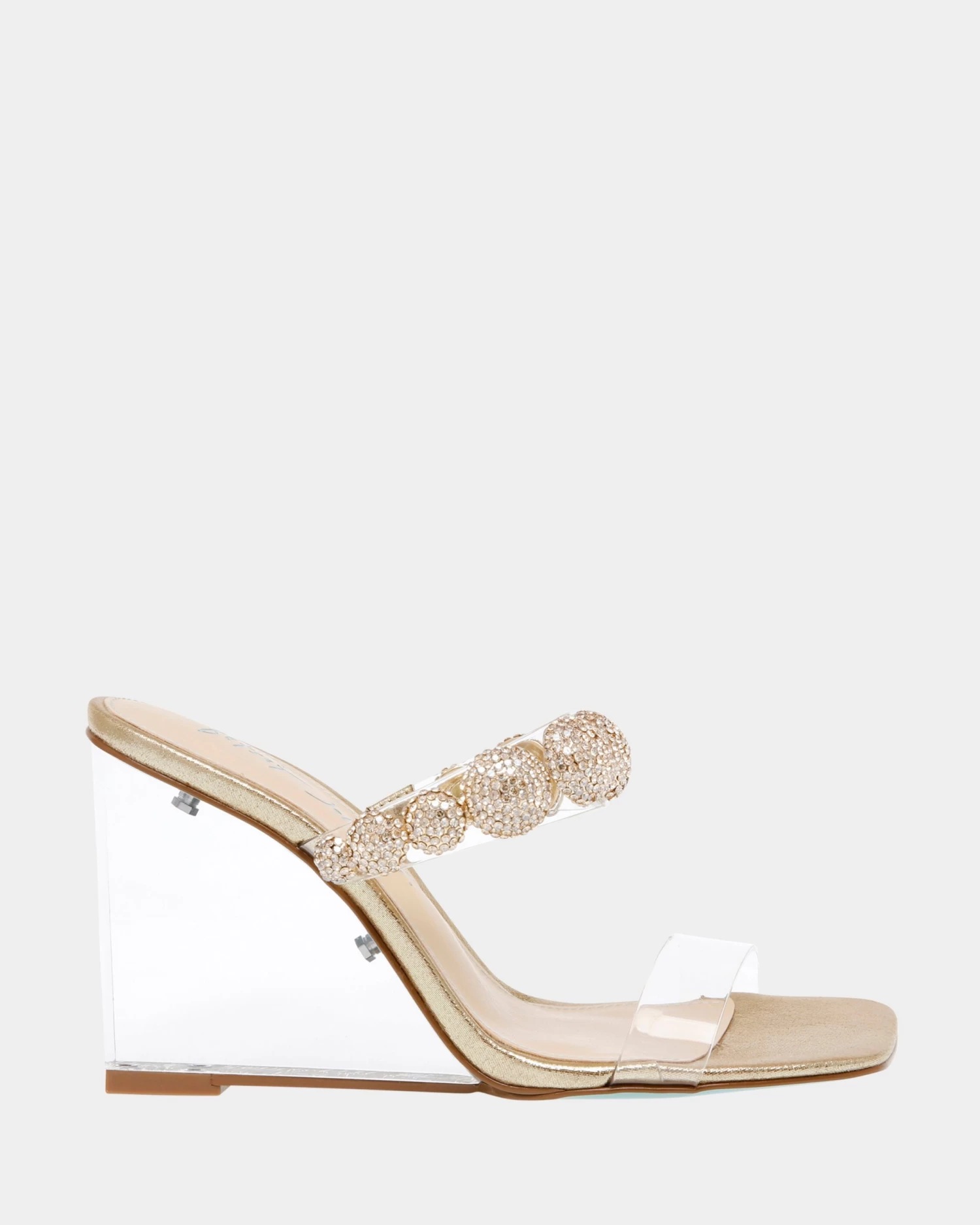 Create an illusion of height with the translucent wedge heel that adds sophistication and elegance to your look. The rhinestone embellishments will add a luxurious touch to your outfit, making it the perfect choice for a night out, a wedding, or any special occasion.